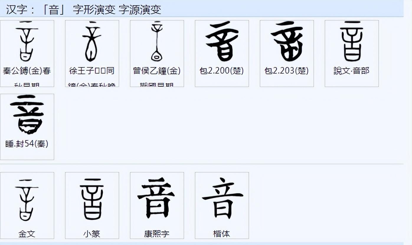《说文解字》:“音,声也。生于心,有节于外,谓之音。宫商角征羽,声;丝竹金石匏土革木,音也。从言含一。”