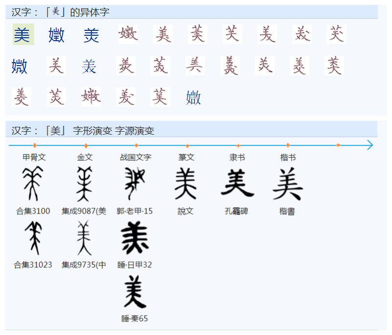 《说文解字》:“美,甘也。从羊、从大。羊在六畜主给膳也。美与善同意。”。
