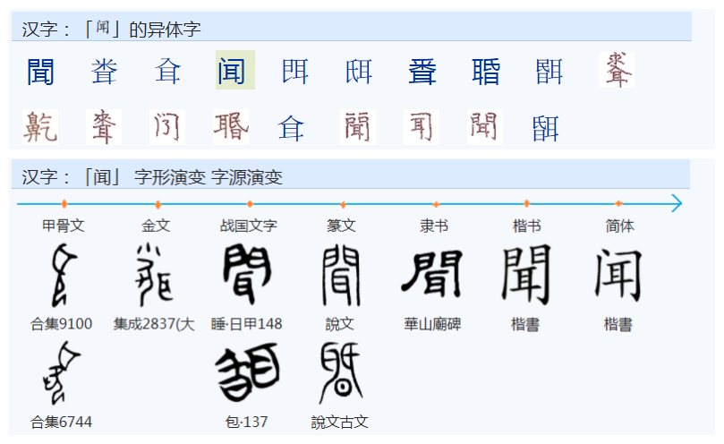 《说文解字》:“聞,知聞也。从耳、門声。,古文从昏。”。