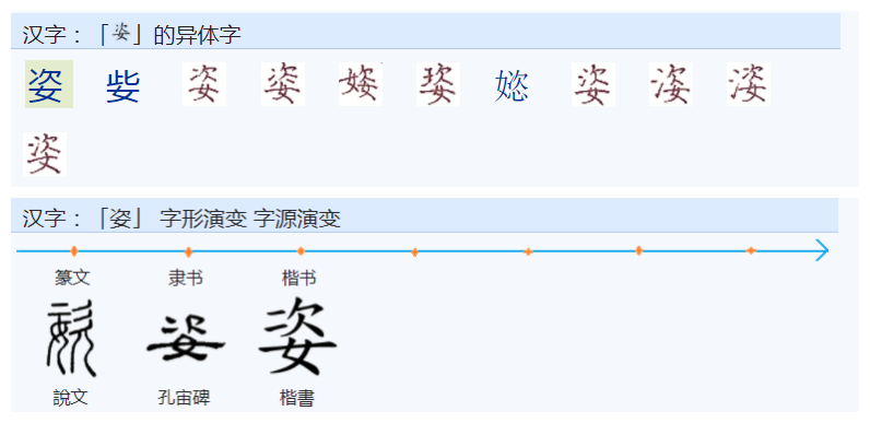 《说文解字》:“姿,态也。从女、次声。”。