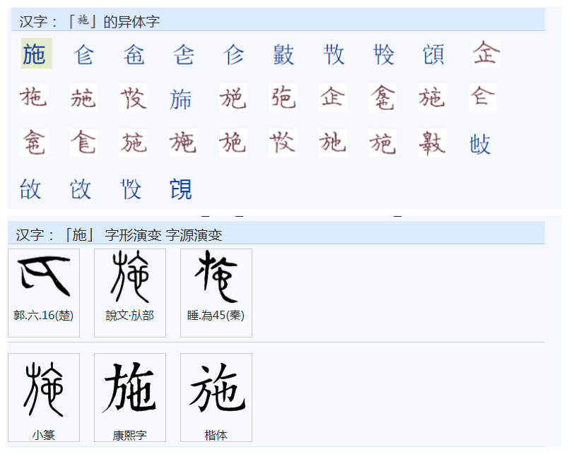 《说文解字》:“施,旗皃。从、也声。亝栾施字子旗,知施者旗也。”。