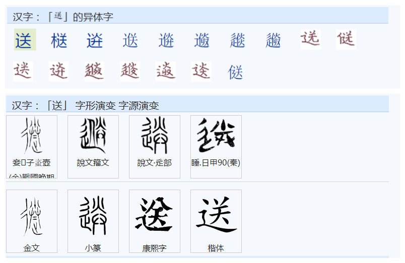 《说文解字》:“送,遣也。从辵、省。”。