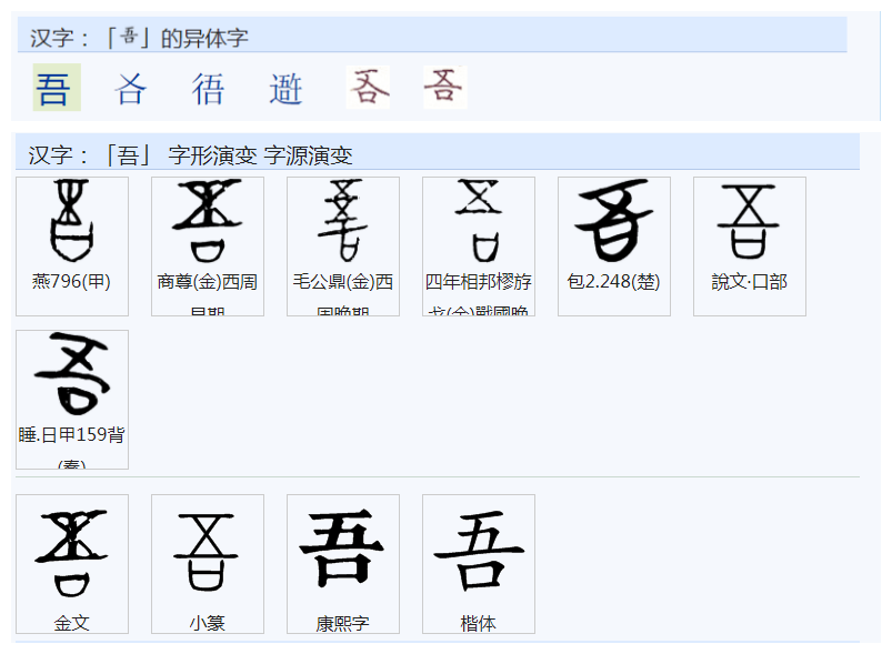 《说文解字》:“吾,我,自称也。从口、五声。”。