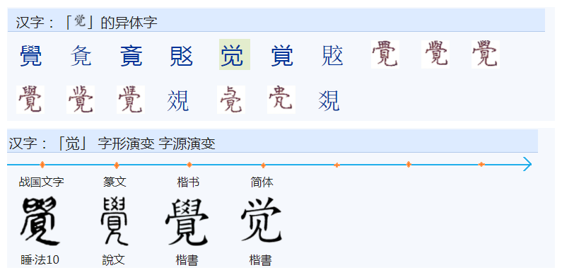 《说文解字》:“覺,寤也。从見,學省声。一曰发也。”。