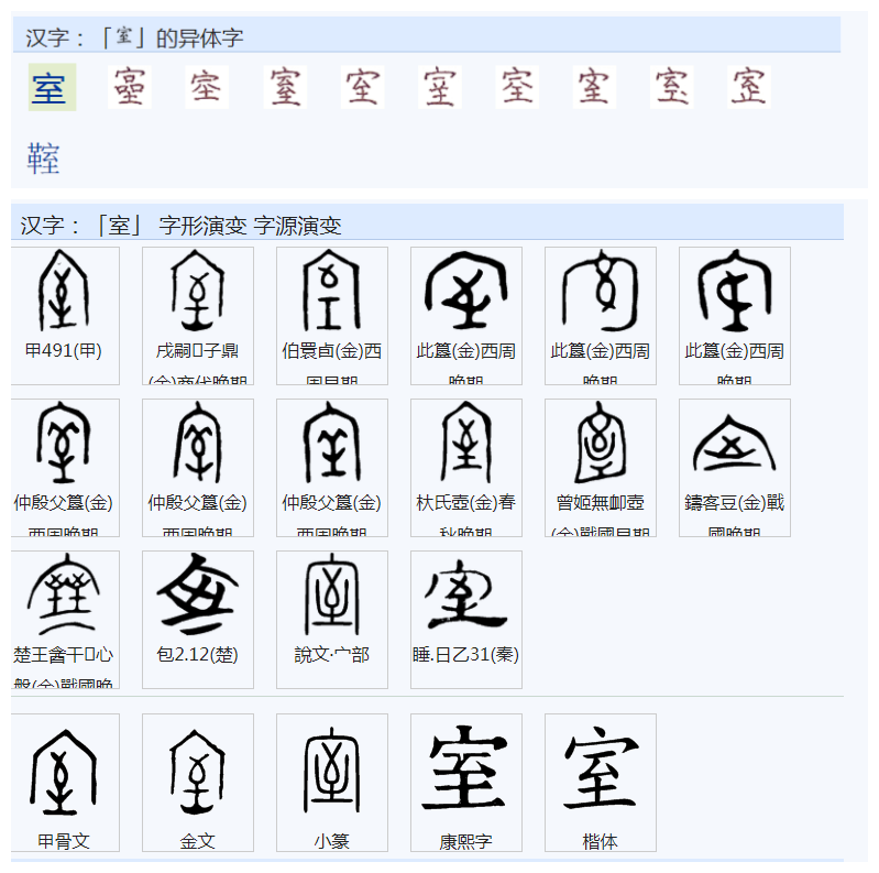 《说文解字》:“室,实也。从宀、从至。至,所止也。”。