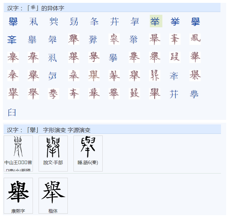 《说文解字》:“擧,对舉也。从手、與声。”。