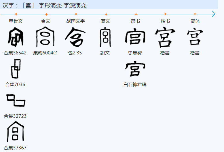 《说文解字》:“宫,室也。从宀、躳省声。凡宫之属皆从宫。”。