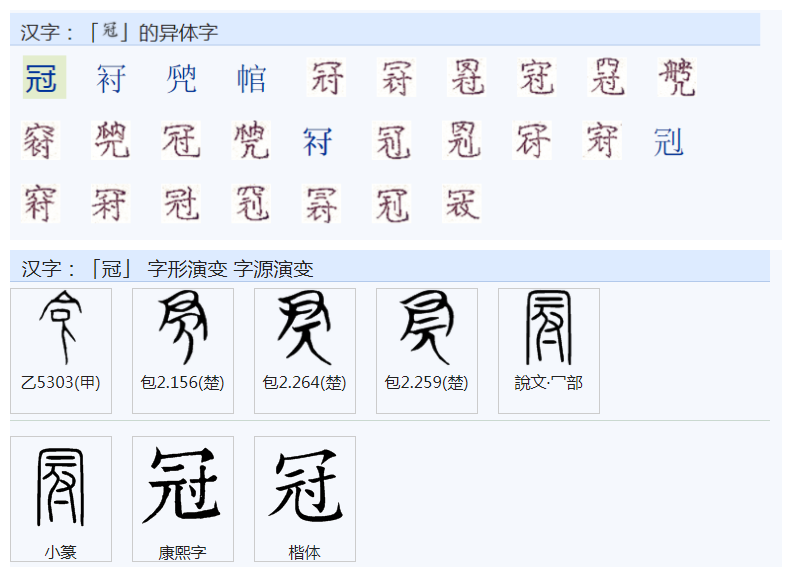 《说文解字》:“冠,絭也。所以絭发,弁冕之总名也。从冂、从元,元亦声。冠有法制,从寸。”