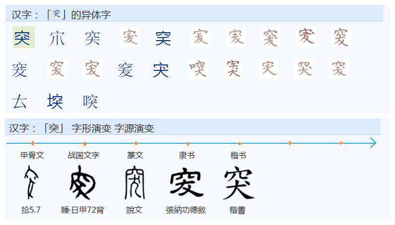 《说文解字》:“突,犬从穴中暂出也。从犬在穴中。一曰滑也。”
