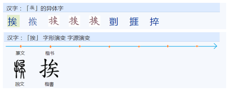 《说文解字》:“挨,击背也。从手、矣声。”。