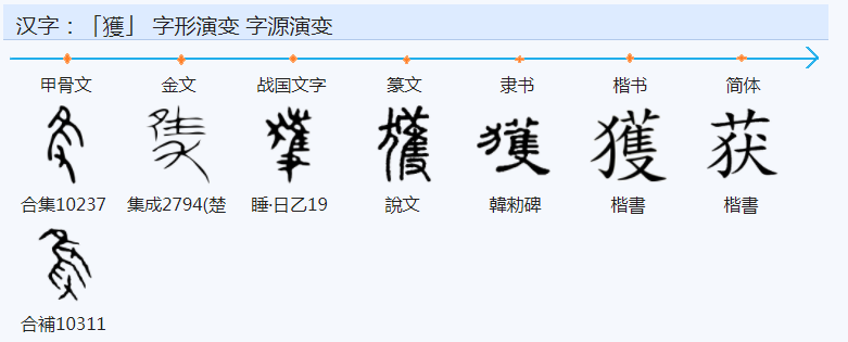 《说文解字》:“獲,猎所獲也。从犬、蒦声。”。