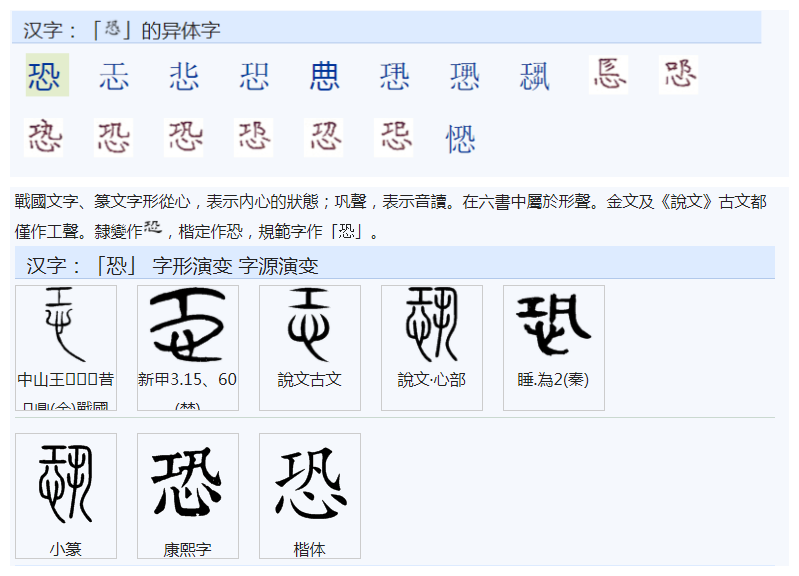 《说文解字》:“恐,惧也。从心、巩声。”。