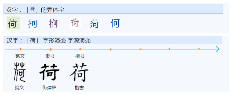 《说文解字》:“荷,芙蕖叶。从艸、何声。”。