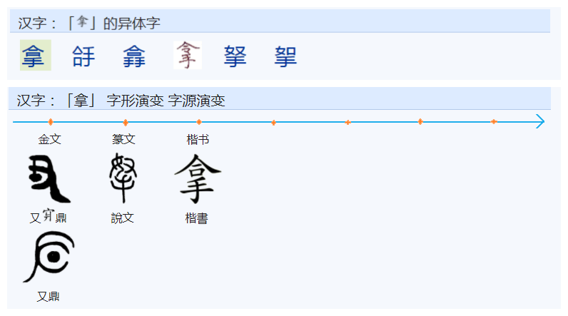 手、合两范式叠加:犹手牵引抓住物事者是拿字之范式。