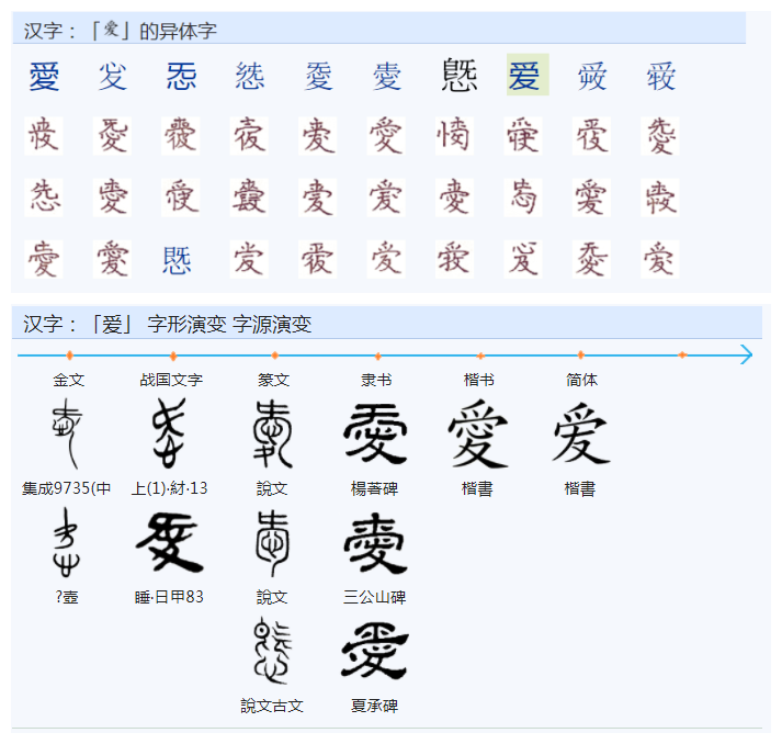 繁体字“愛”简化为“爱”是根据古人(异体字、同旁字)书法省笔规范简化。