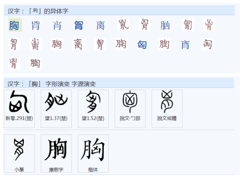 肉、匈两范式叠加:身体前面颈下腹上之部分犹指心所怀者是胸字之范式。