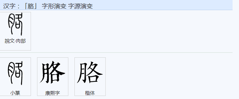《说文解字》:“胳,亦下也。从肉、各声。”。