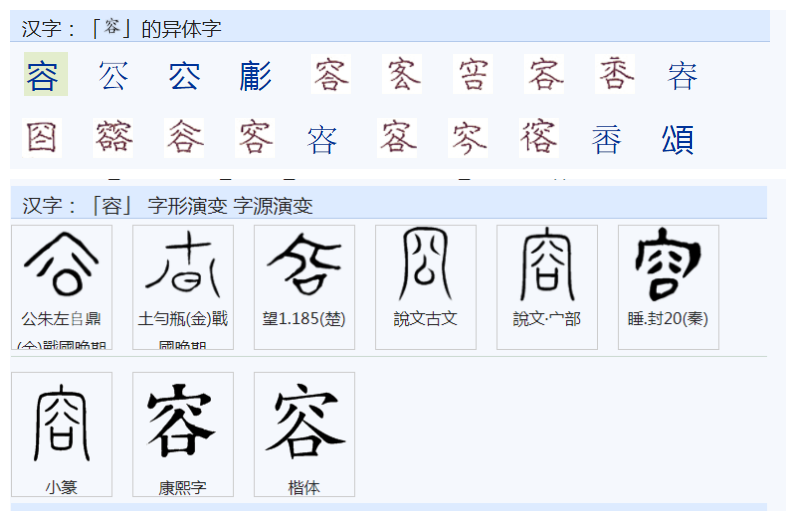 《说文解字》:“容,盛也。从宀、谷。,古文容从公。”