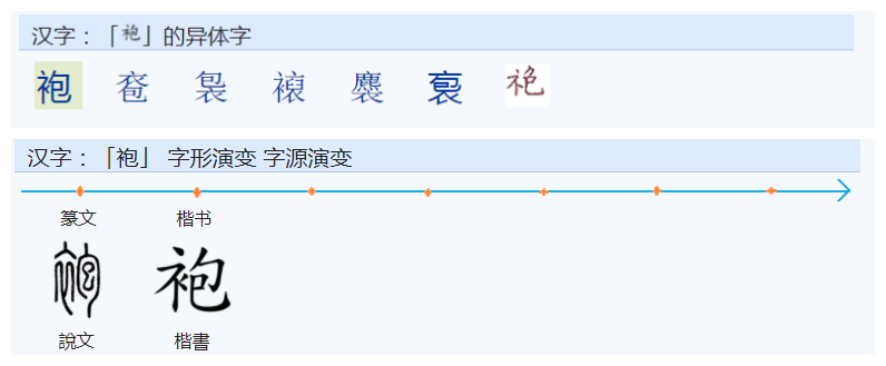 《说文解字》:“袍,襺也。从衣、包声。《论语》曰:‘衣弊緼袍。’。”。