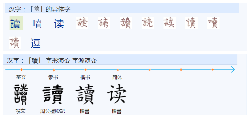 《说文解字》:“讀,诵书也。从言、賣声。”。