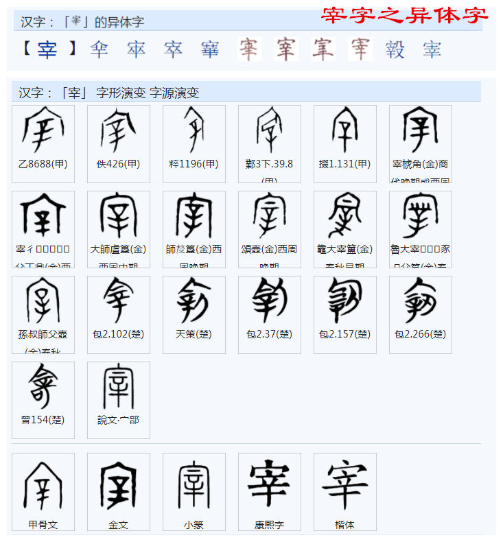 《说文解字》:“宰,辠人在屋下执事者。从宀从辛。辛,辠也。”。
