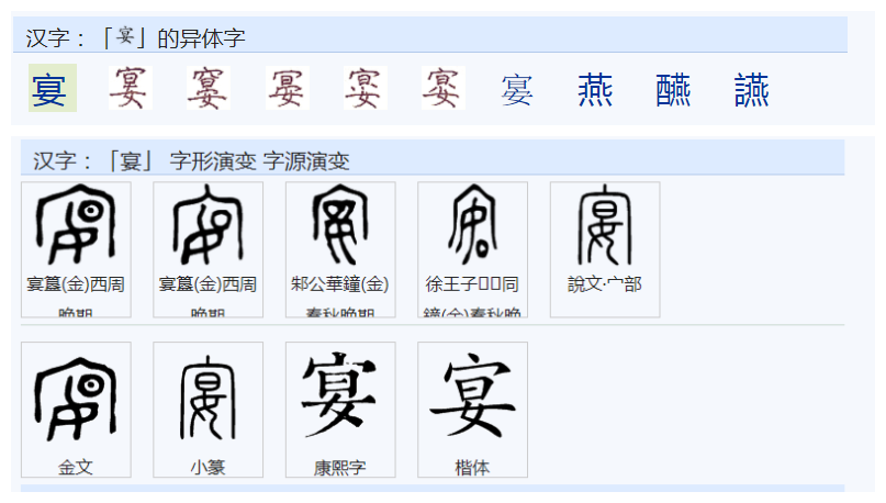 宀、妟两范式叠加:犹若新婚燕尔般以饮食酒席相欢待宾客者是宴字之范式。