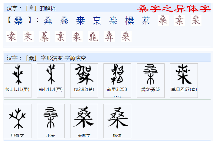 《说文解字》:“桑,蚕所食叶木。从叒、木。”。