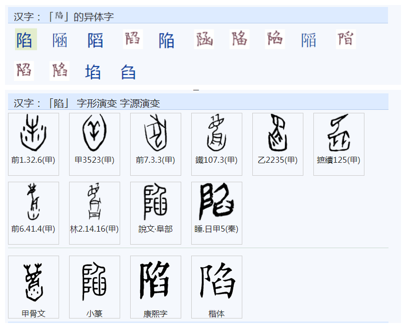 《说文解字》:“臽,小阱也。从人在臼上。”。