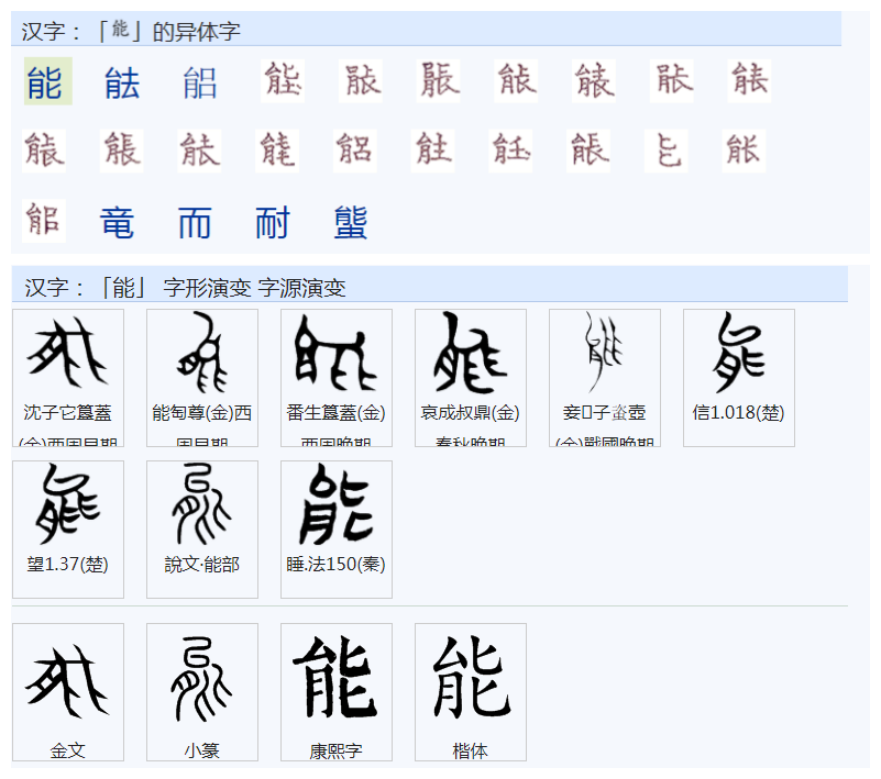 《说文解字》:“能,熊属。足似鹿。从肉、声。能兽坚中,故称贤能;而彊壮,称能杰也。凡能之属皆从能。”