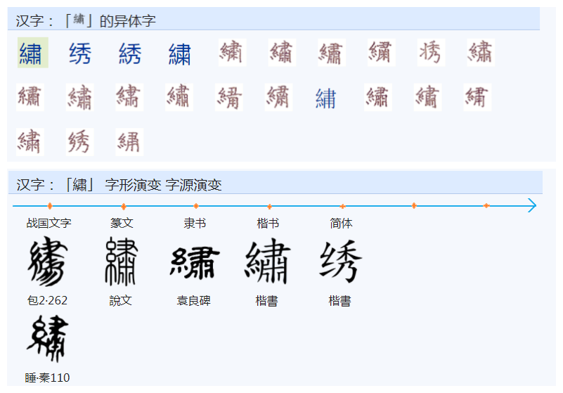 《说文解字》:“繡, 五采备也。从糸、肅声。”。