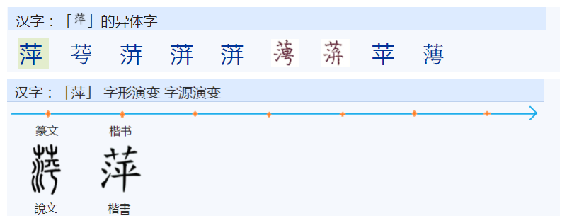 《说文解字》:“萍,苹也。水艸也。从水、苹,苹亦声。”。
