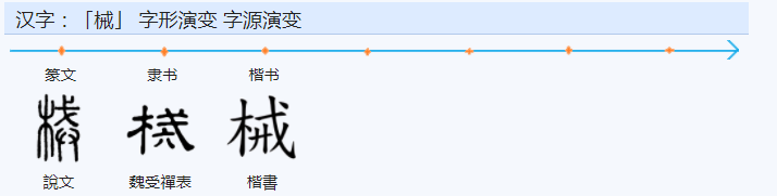 《说文解字》:“械,桎梏也。从木、戒声。一曰器之总名。一曰持也。一曰有盛爲械,无盛为器。”。