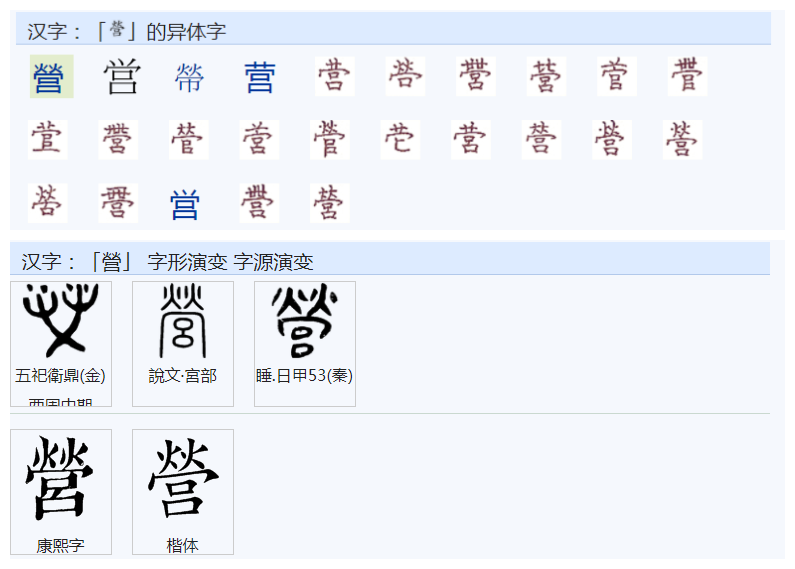 《说文解字》:“營,市居也。从宮,熒省声。”。