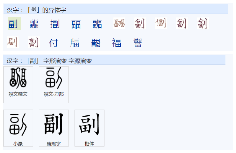 《说文解字》:“副,判也。从刀、畐声。《周礼》曰:‘副辜祭。’ 。”。