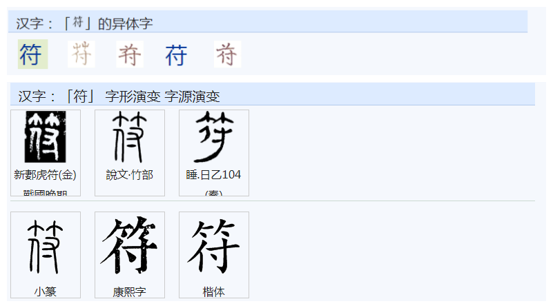 《说文解字》:“符,信也。汉制以竹,长六寸,分而相合。从竹、付声。”。