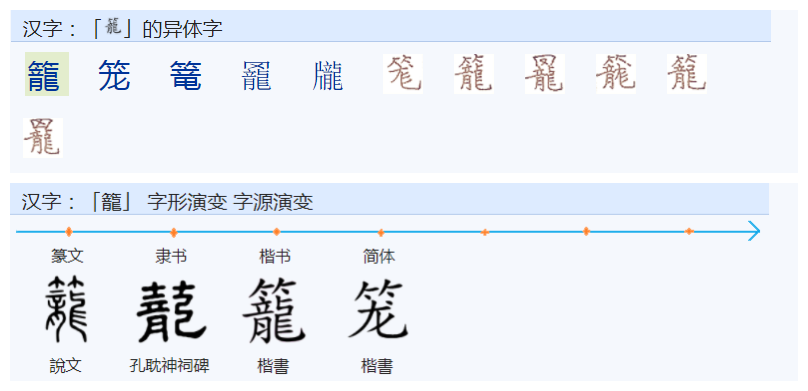 繁体字“籠”简化为“笼”是根据古人(异体字、同旁字)书法省笔规范简化。