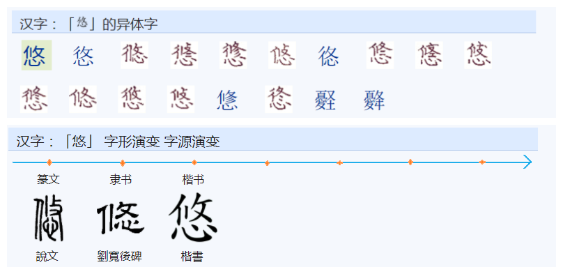 《说文解字》:“悠,忧也。从心、攸声。”。