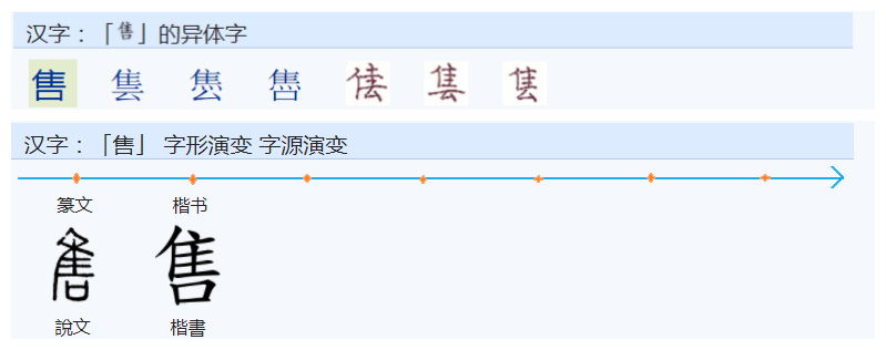 《说文解字》:“售,卖去手也。从口,雔省声。《诗》曰:‘贾用不售。’。”。