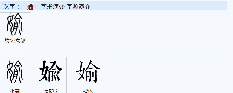 《说文解字》:“媮,巧黠也。从女、俞声。”。