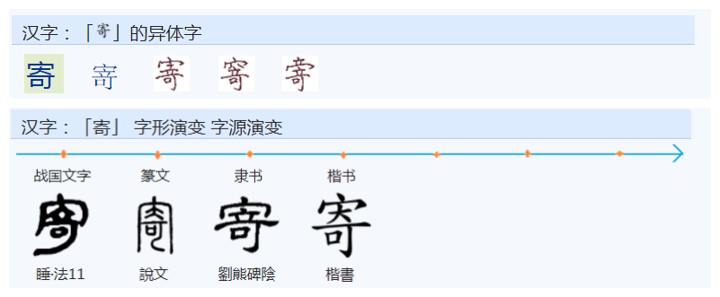 《说文解字》:“寄,托也。从宀、奇声。”。
