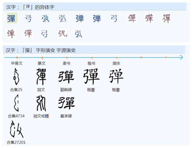 《说文解字》:“彈,行丸也。从弓、單声。”。