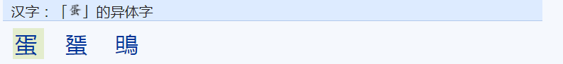 虫、疋两范式叠加:犹鸟类和爬虫类所生带有硬壳之卵者是蛋字之范式。