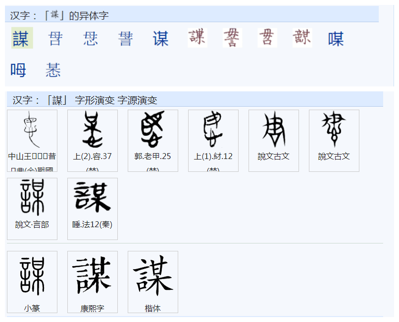 《说文解字》:“謀,虑难曰谋。从言、某声。”。