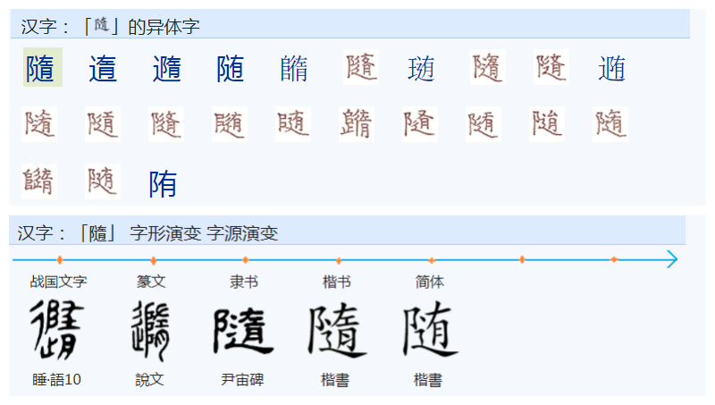 《说文解字》:“隨,从也。从辵、隋声。”。