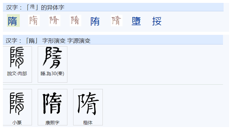 《说文解字》:“隋,裂肉也。从肉,从隓省。”。