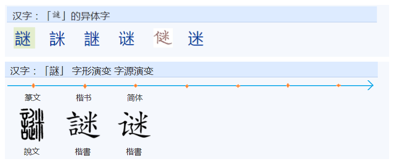 《说文解字》:“謎,隐语也。从言、迷,迷亦声。”。