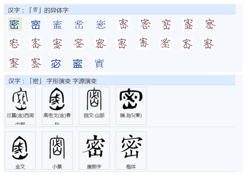 《说文解字》:“密,山如堂者。从山、宓声。”。