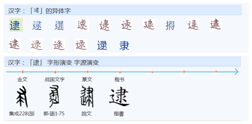 辵、隶两范式叠加:犹追捕抓住奴隶者是逮字之范式。