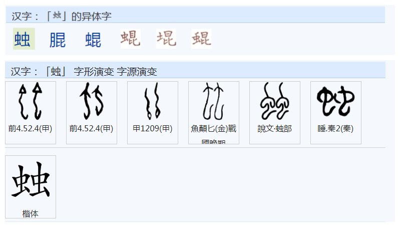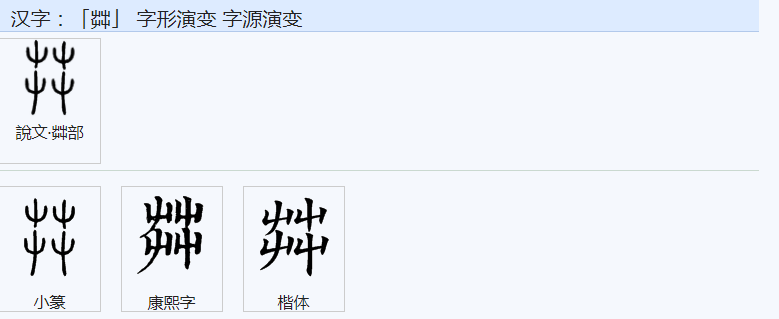 《说文解字》:“,虫之总名也。从二虫。凡之属皆从。”。