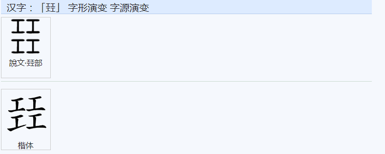 《说文解字》:“,极巧视之也。从四工。凡之属皆从。”。